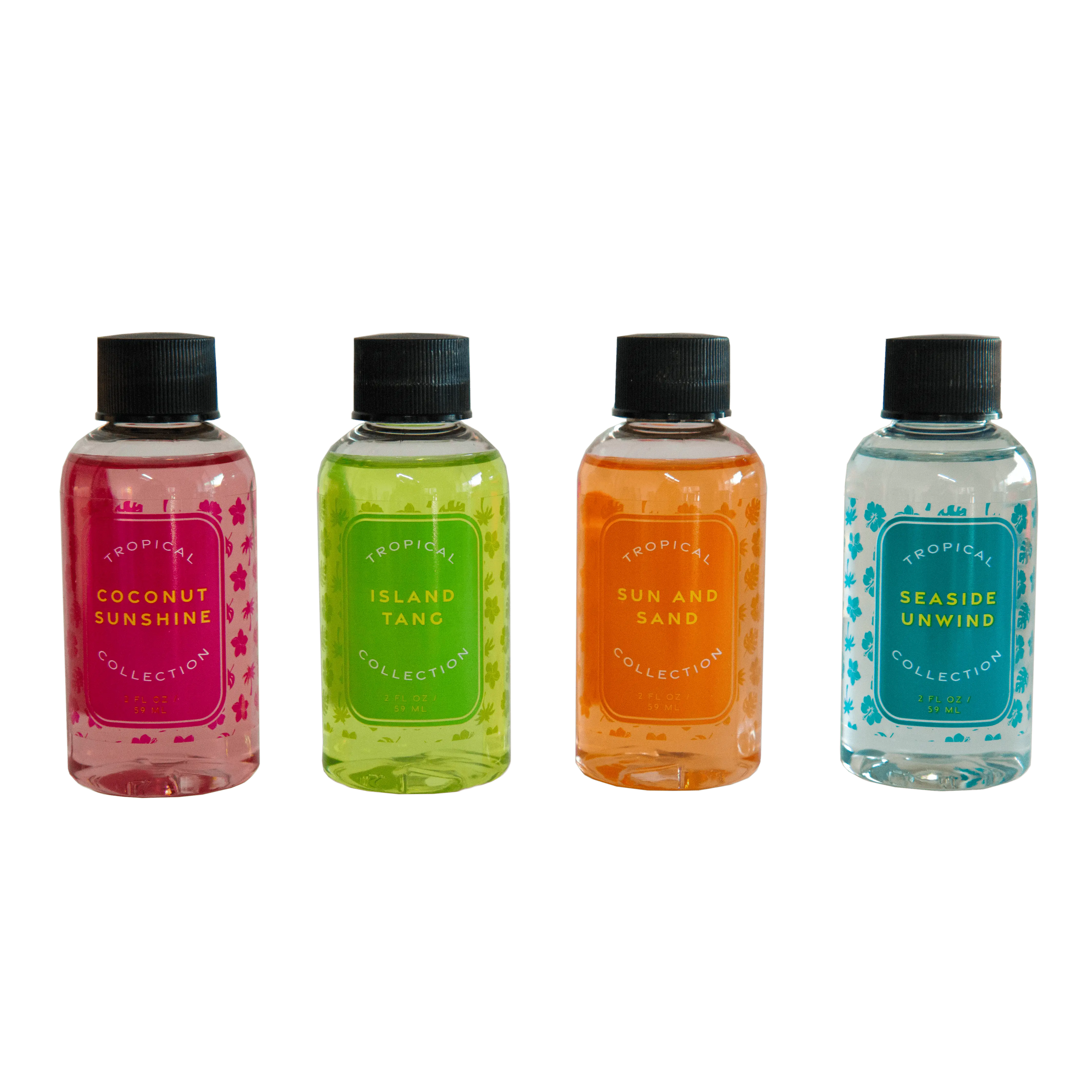 Conjunto de 4 fragrâncias da coleção Tropical (Coconut Sunshine - coco, hibisco e sal marinho; Island Tang - limão, cítrico e floral; Sun and Sand - roupa lavada e brisa do mar; Seaside Unwind - água salgada, cipreste azul e ar costeiro)