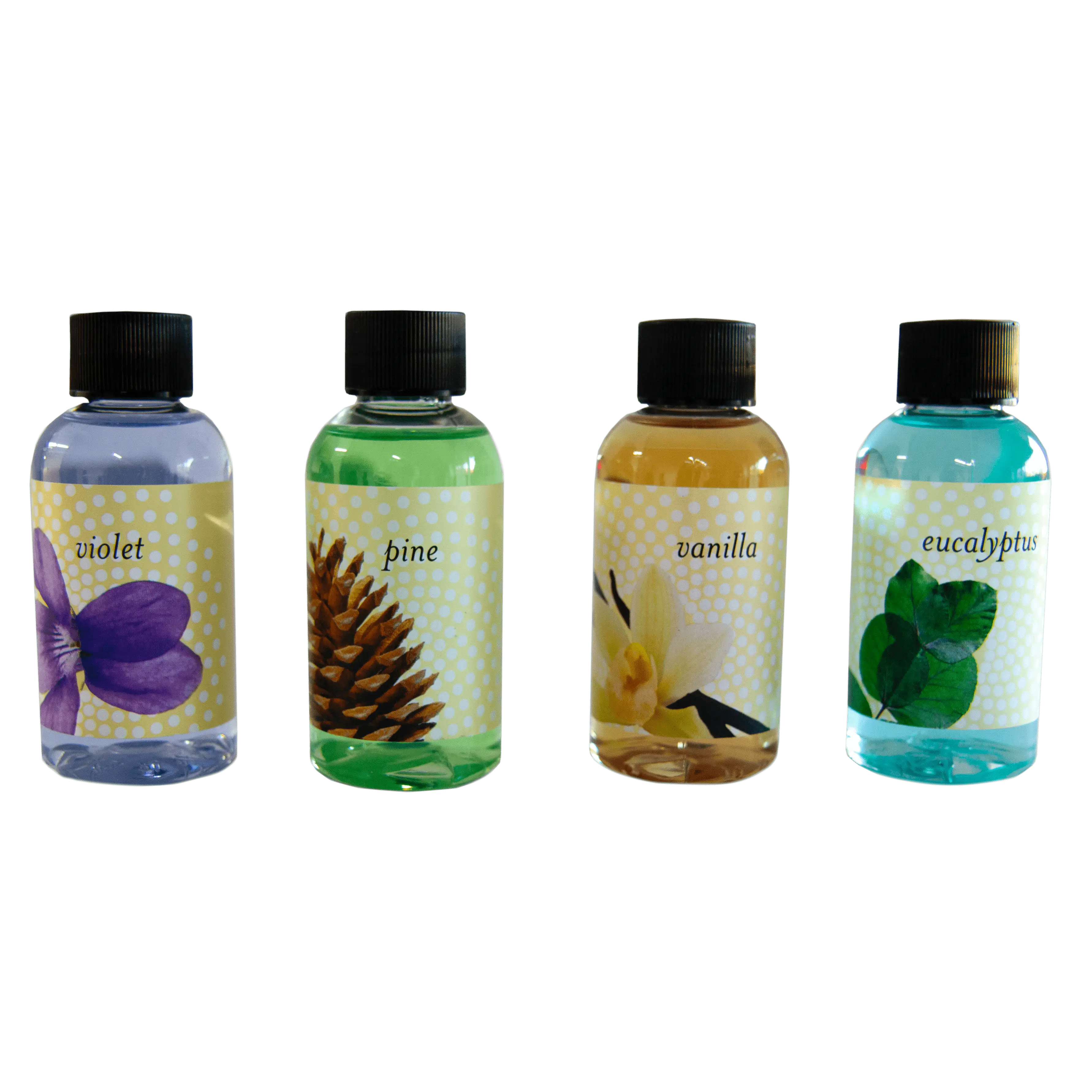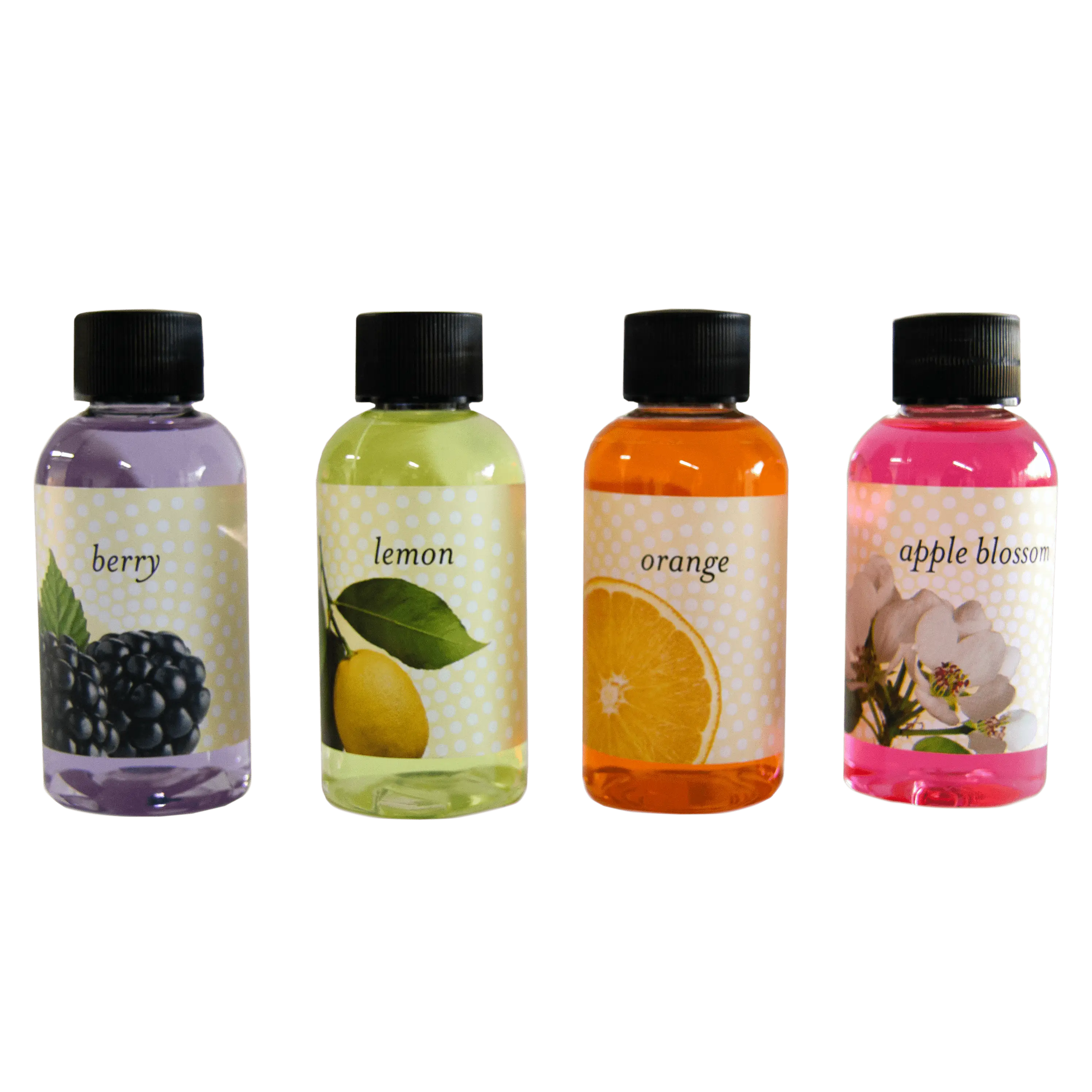 Conjunto de 4 Fragâncias naturais sortidas com 59ml cada. Flor de Maçã, Amora, Eucalipto, Limão, Laranja, Pinho, Baunilha, Violeta.